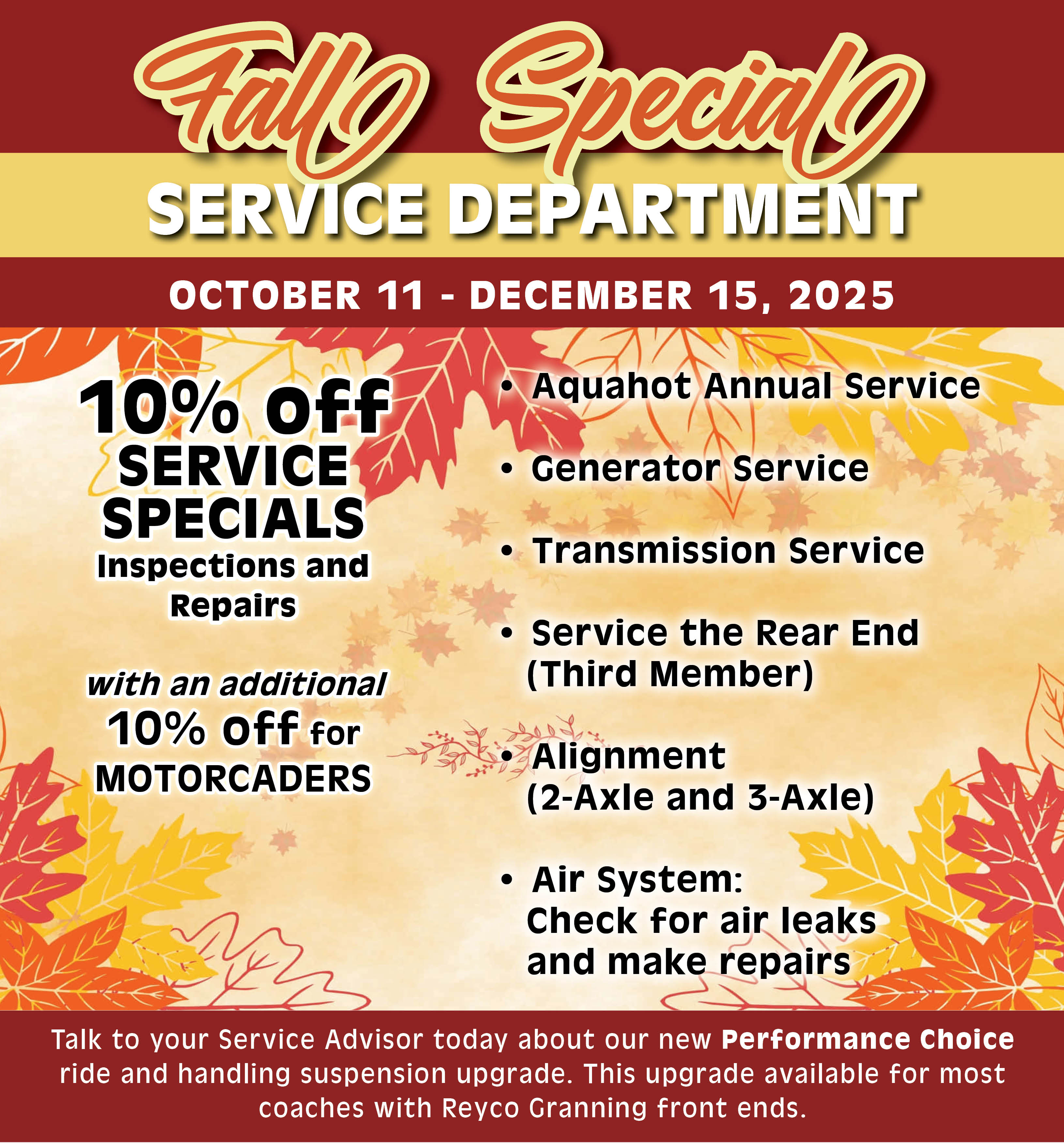 For more information on Foretravel of Texas Service Specials, contact ext. 205 or 277.